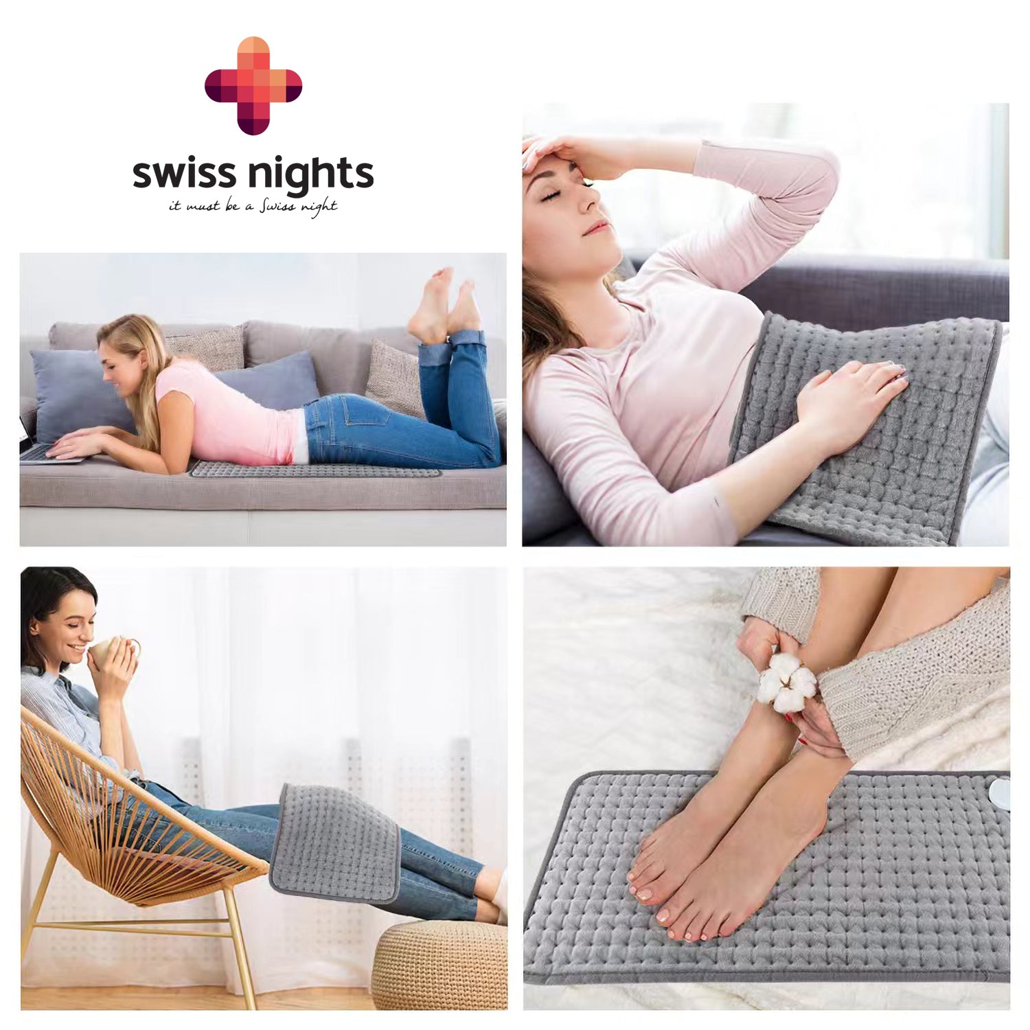 Šildantis kilimėlis Swiss Nights yra kompaktiško dydžio – 60x30 cm, todėl patogiai priglunda prie kūno. Jis turi 10 skirtingų šilumos lygių, integruotą laikmatį iki 120 min. ir apsaugą nuo perkaitimo, užtikrinančią saugų naudojimą. Elektrinis šildantis kilimėlis naudoja vos 75 W galios, todėl yra taupus, greitai įkaista ir leidžia mėgautis šiluma bei komfortu bet kuriuo metu.