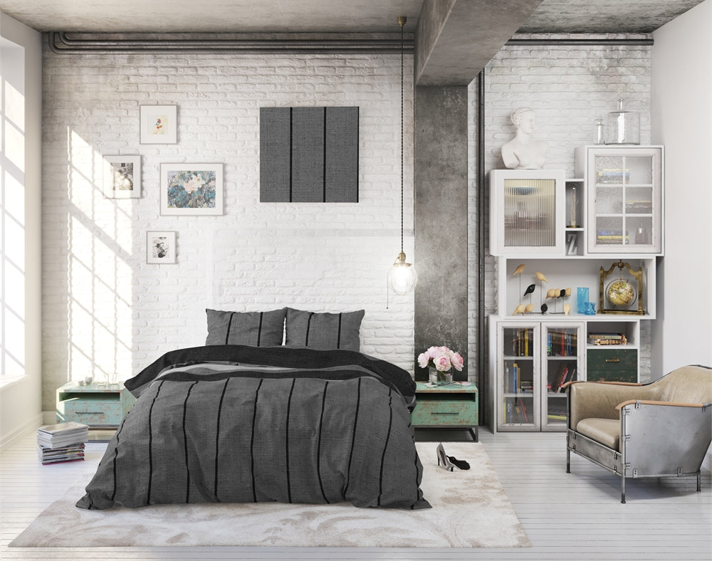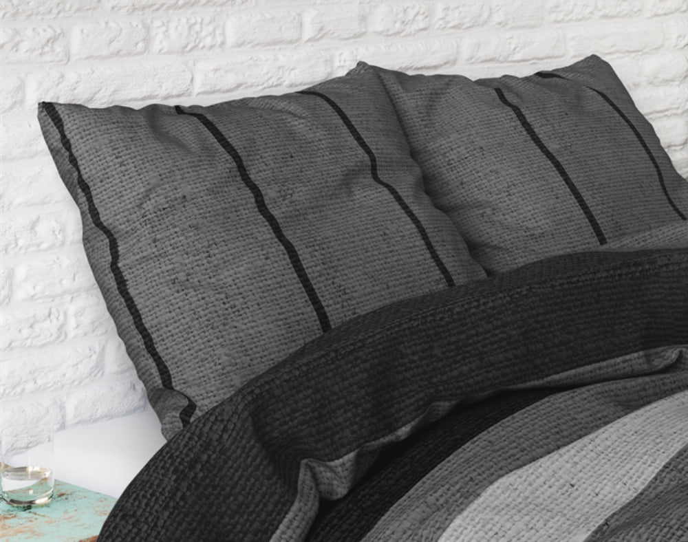 Šis pilkos spalvos komplektas pasižymi šiuolaikišku dizainu ir subtilia tekstūra, kuri suteikia miegamajam jaukumo ir elegancijos.