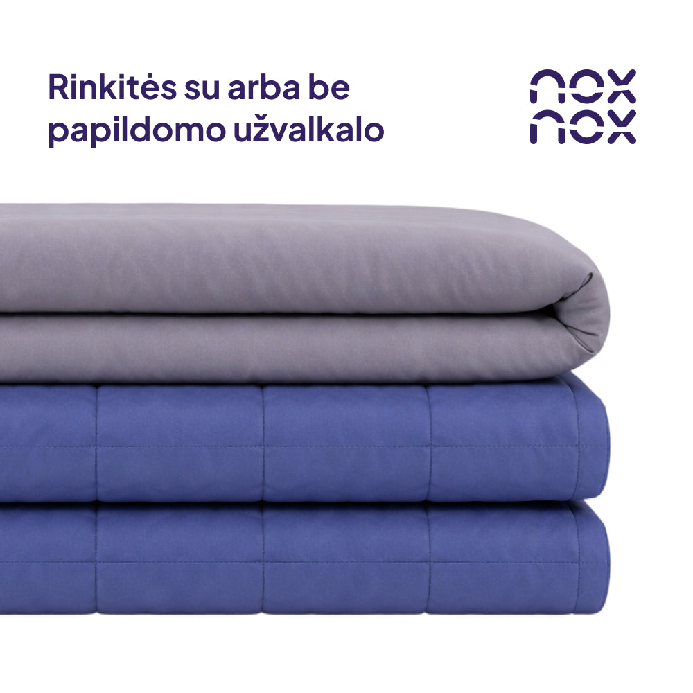 NOXNOX sunkios antklodės siūlo individualų miego potyrį, renkantis 5,7,8,9 ir 11 kg. svorio antklodes. Rinkitės 7kg. jeigu sveriate tarp 60 ir 80kg. Rinkitės 9kg. jeigu sveriate daugiau.
