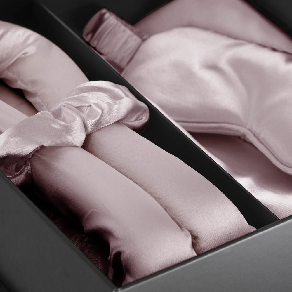 Įpakuotas dėžutėje leist tinkamai pasirūpinti jūsų plaukų ir odos būkle. Rinkinys specialiai sukurtas apsaugoti jūsų plaukus ir odą miegant. Satininis pagalvės užvalkalas neleis jūsų plaukams slinkti naktį ir susidaryti miego raukšlėms. Satino akių kaukė yra itin švelni ir patogi. Satininė plaukų gumytė prilaikys plaukus jų nepažeisdama, idealiai tinka visų tipų plaukams, o garbanų juosta padės formuoti jūsų plaukus kol miegate. Toks rinkinys ideliai tinka dovanai.